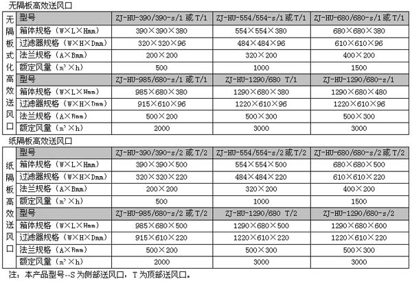 高效送風(fēng)口規(guī)格尺寸及技術(shù)參數(shù):